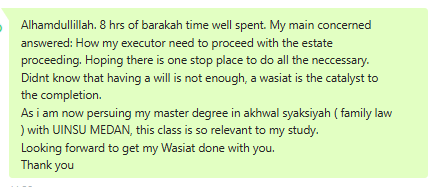 After the class, you can book a private Zoom session with us to review your Wasiat plan and ensure you’re on the right track.