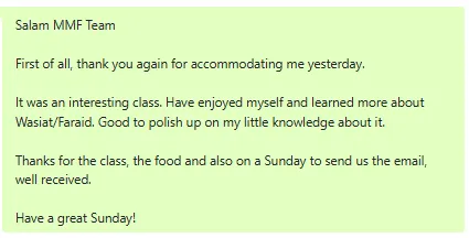 You’re not alone after the class. Reach out anytime if you need guidance or clarifications in your Wasiat journey.